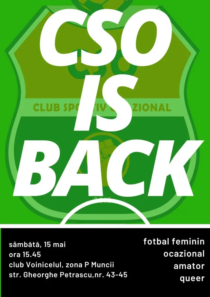Club Sportiv Ocazional este un grup informal ce militează pentru un stil de viață sănătos prin practicarea sportului. Întâlnirile din cadrul “Fotbal Feminin Ocazional” sunt destinate tuturor femeilor indiferent de vârstă, experiență, orientare sexuală, religie. Very queer friendly.